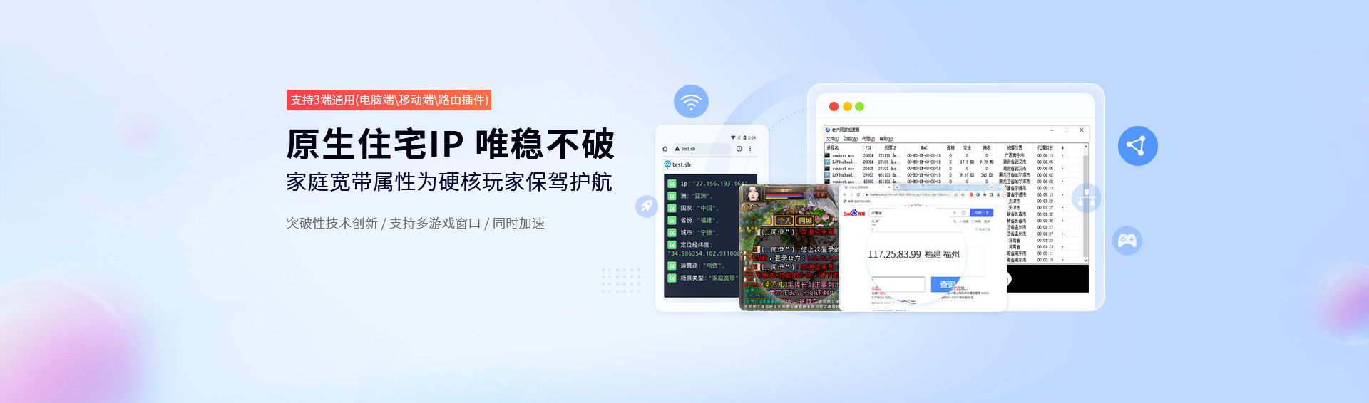 支持电脑端、移动端、路由插件三端加速。全方位为硬核游戏玩家保驾护航